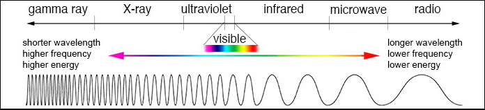 Visible light, that is. All colors known to man can be found in the visible spectrum of light. On the longest wavelength/lowest frequency/lowest energy end we have RED, spanning across to the shortest wavelength/highest frequency/highest energy end with VIOLET (along with orange, yellow, green and blue in between). So, radio waves (plus infrared and microwave) have the least energy, and gamma rays (plus UV and X-rays) have the most energy, which is part of what makes them so dangerous to humans. The whole range of frequencies and energies is called the electromagnetic spectrum.